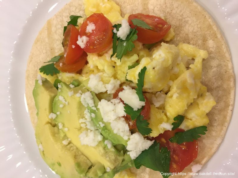 - To assemble the tacos, add the sliced avocado on the bottom. Then top with eggs, tomatoes, green onion, cilantro, queso fresco and squeeze plenty of lime juice on the top of each one. Top with salsa, if desired. All the ingredients should be split into four as you are assembling the tacos.