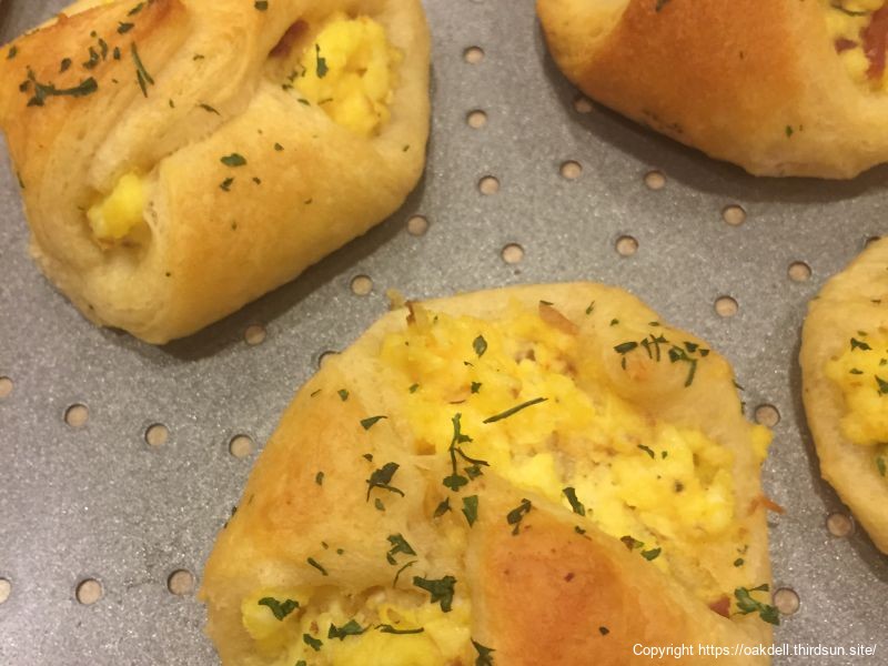 - Place rounded spoonful of scrambled egg mixture on the center of each triangle. Bring corners to the center over filling, overlapping the ends. Press gently to seal. Sprinkle the top of each with dried parsley for garnish.