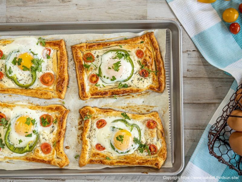- Beat 1 egg with 1 tablespoon water in a small bowl. Set aside. Spread 1 tablespoon of cream cheese spread over each pastry. Top with a bell pepper strip and sliced tomatoes. Brush with egg wash and bake for 12-15 minutes. Crack an egg into the center of each pastry. Bake for another 8-10 minutes or until egg whites are set. Garnish with salt, pepper, and parsley.
