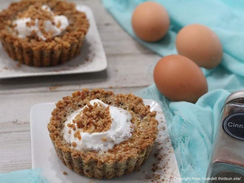 - 1.Preheat oven to 350 degrees. To make the crust, melt butter in a skillet. Remove from heat and stir in pretzel and brown sugar. Cook over medium heat for 2 minutes. Spray 5 mini tart pans with non-stick cooking spray. Press pretzel mixture into tart pans. Bake for 8-10 minutes.2. In a small saucepan heat milk on medium-low each until simmering not boiling. Remove from heat.3. Beat egg yolks and sugar together in a medium bowl until light in color. Slowly pour in milk while whisking. Stir in vanilla. Bake for 20-30 minutes or until cooked through but slightly giggly. Remove from oven and let cool.4. Top with whipped topping, cinnamon, and remaining pretzel mixture.