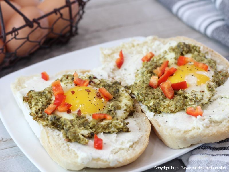 - Warm a large non-stick skillet over medium heat. Once heated, spread pesto in 2 thin layers on the pan and add an egg on top of each. Cook until the egg whites are firm, about 3 minutes. Push excess pesto on top of egg whites using a spatula. Sprinkle with salt, red pepper flakes, and pepper. Top with red bell pepper and place eggs on top of bread slices.