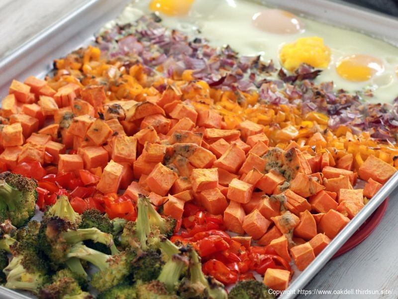 - Preheat oven to 450 degrees F. Spread veggies in rows by color on a sheet pan sprayed with non-stick spray. Leave room at the bottom of the pan for eggs.
