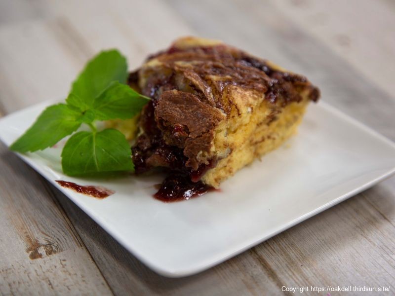 - Pour batter in prepared pan. Dollop jam and hazelnut spread on top and swirl with a spoon. Bake for 10-15 minutes or until the center is firm.