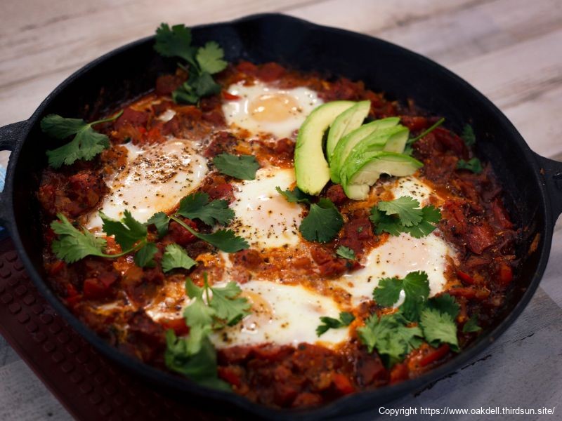 - Using a spoon make wells for the eggs. Crack an egg into each egg well. Place skillet into the oven and cook for 8-12 minutes or until egg whites are cooked. Garnish with feta, avocado, and cilantro.