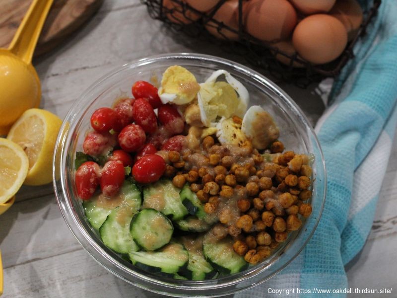 - Place lettuce in a medium bowl. Top with cucumbers, tomatoes, sliced eggs, and crispy chickpeas.