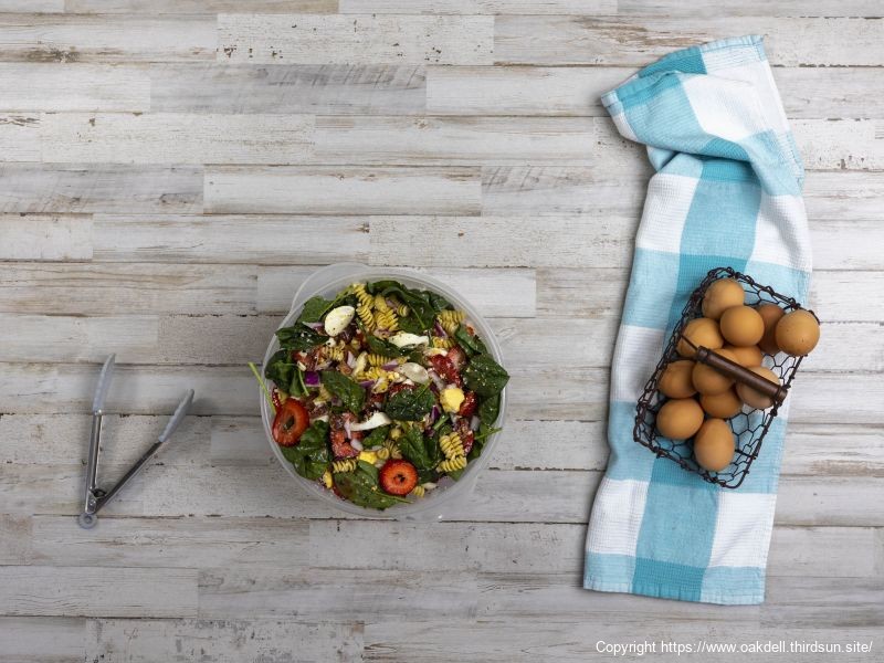 - To assemble, add Oakdell eggs, bacon, strawberries, onion, feta cheese and pecans. Just before serving, toss in spinach, remaining vinaigrette and salt and pepper, to taste.